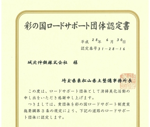 埼玉県より「彩の国ロードサポート団体」として認定を受けました